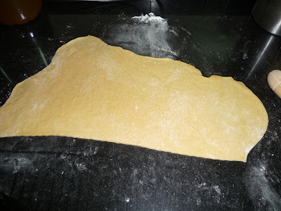 Estender a massa numa superficie polvilhada com farinha. Não convém estender muito fina.